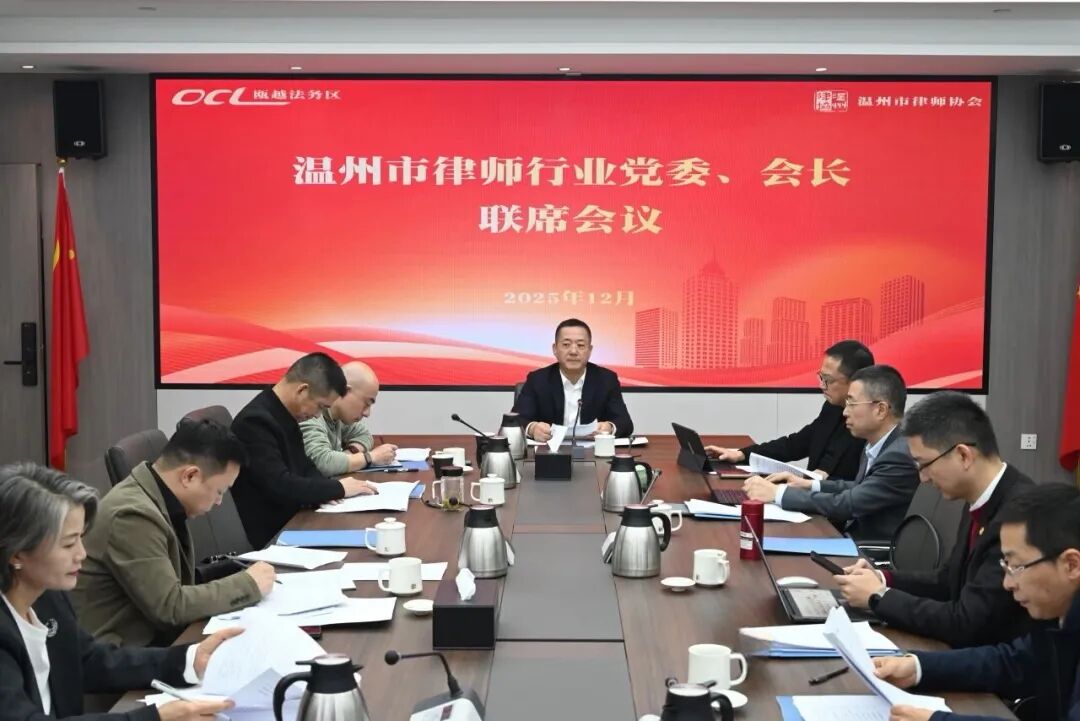 12月17日,温州市律师行业党委、会长联席会议召开。温州市司法局党委委员、副局长、市律师行业党委书记林向光,市律师协会会长金疆,市司法局律工处处长董航,市律师协会监事长杨康乐等出席会议。
